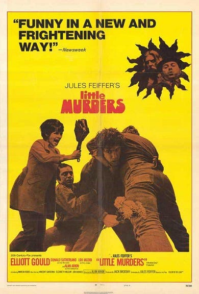 Originating as a play written by Jules Feiffer in the aftermath of the Kennedy assassination when the writer felt like the country was undergoing a collective nervous breakdown, it’s hard not to think that by the time the film, directed by Alan Arkin, came out several years later as the ‘60s turned into the ‘70s it felt even more of the moment. Maybe it’s even more of the moment right now. Of course, things are strange these days. On a personal level, certain things are very good and maybe better than they’ve been in a long time but then there’s the world around us. You don’t need me to tell you. Feiffer’s inspiration for writing the play is the sort of thing that makes the film version of LITTLE MURDERS likely play better now than it has in decades. It’s a little depressing to think that no one is going to make a movie like this which examines things right now in this sort of way but, in fairness, no one knows what form that breakdown will be taking once another year has passed. But we still have LITTLE MURDERS, to tell us what that feeling of someone understanding the moment can be like.